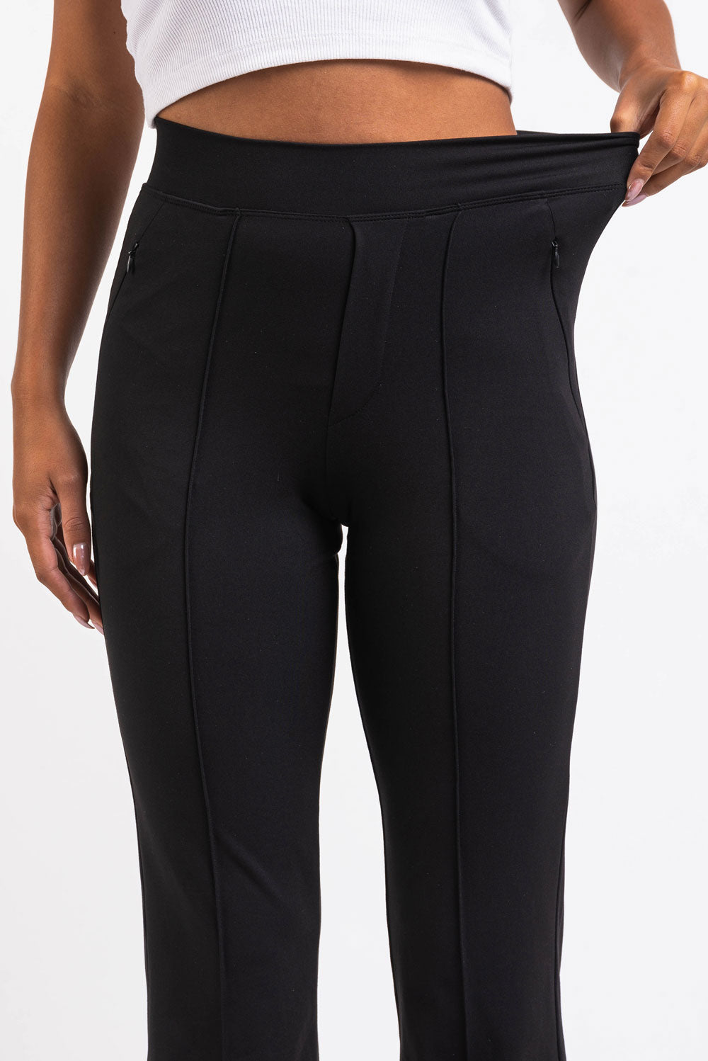 Hybrid pants with the best of two worlds - they're sporty and comfy with a dressy look. The pants have two side pockets with zippers. The waist is stretchy, and the legs are flared.