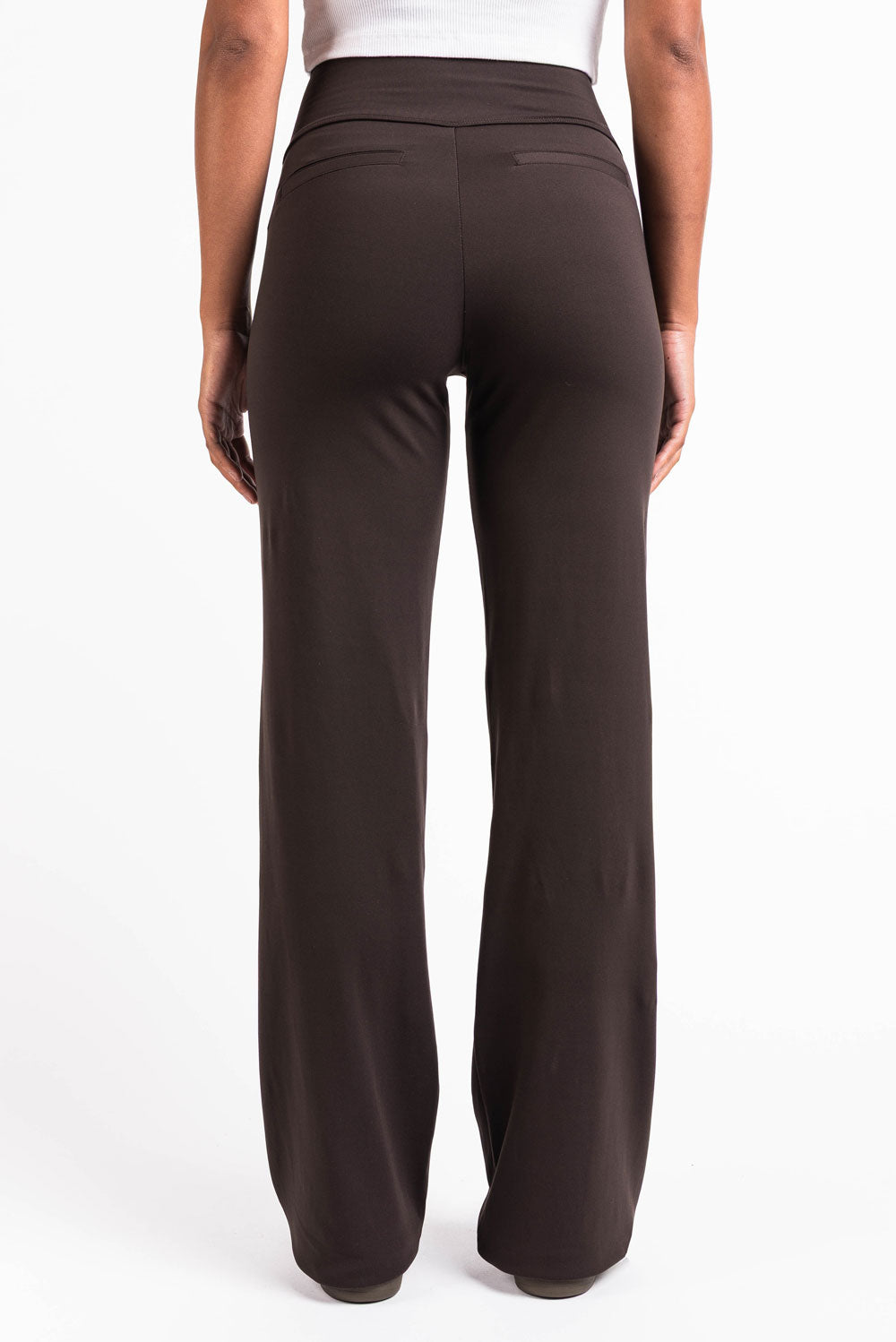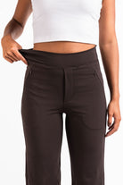 Hybrid pants with the best of two worlds - they're sporty and comfy with a dressy look. The pants have two pockets in the front and two pockets in the back. The waist is stretchy, and the legs are straight and wide.