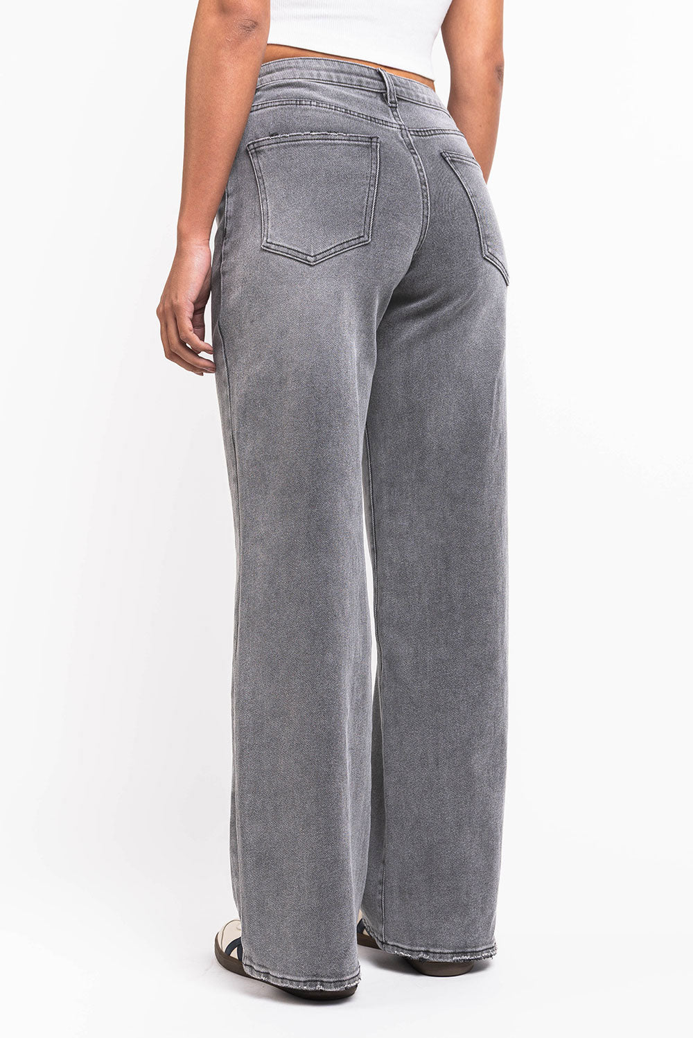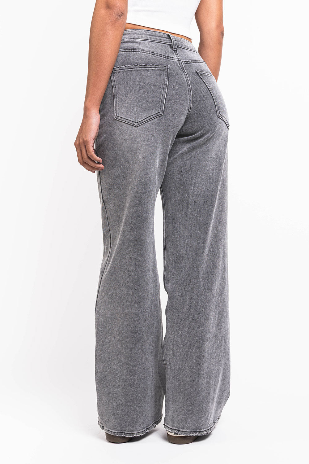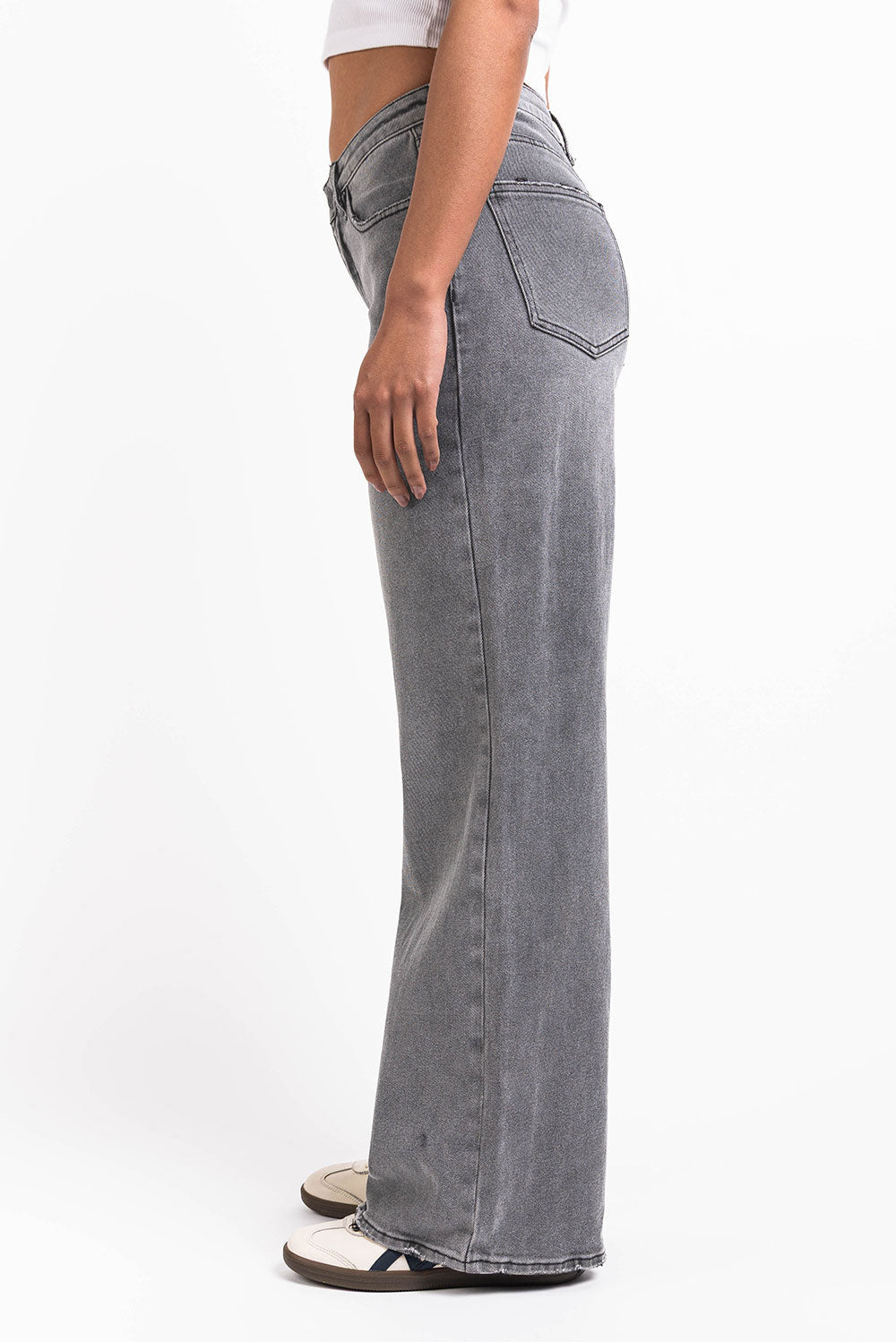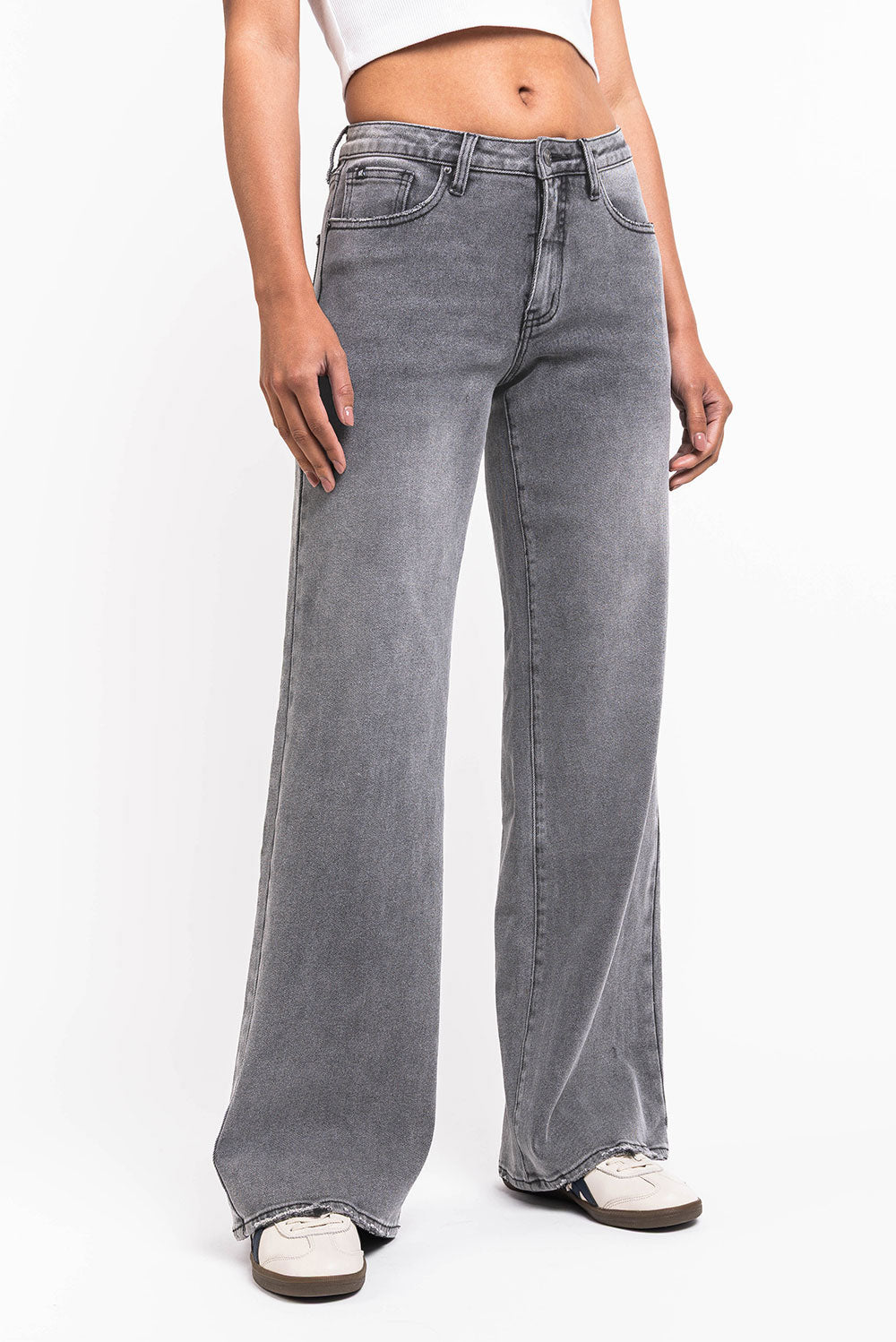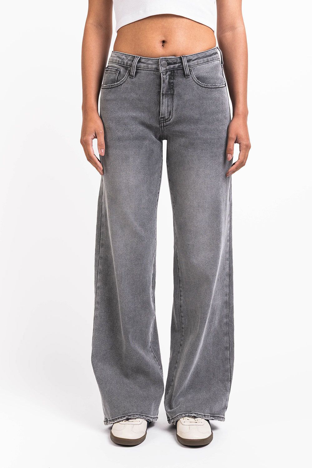 Mid waist jeans with wide legs and pockets in the front and back. Belt loops that fit both thinner as well as a thicker belt. The pants close with a zipper and button.