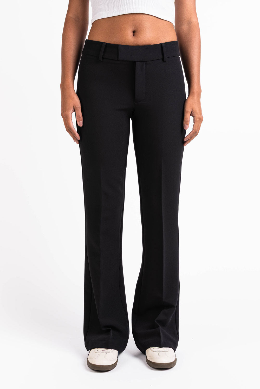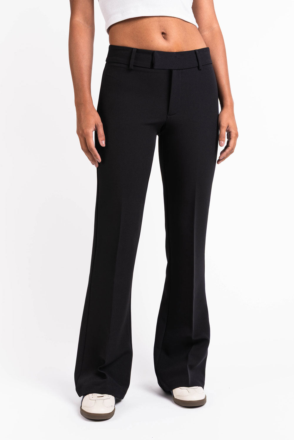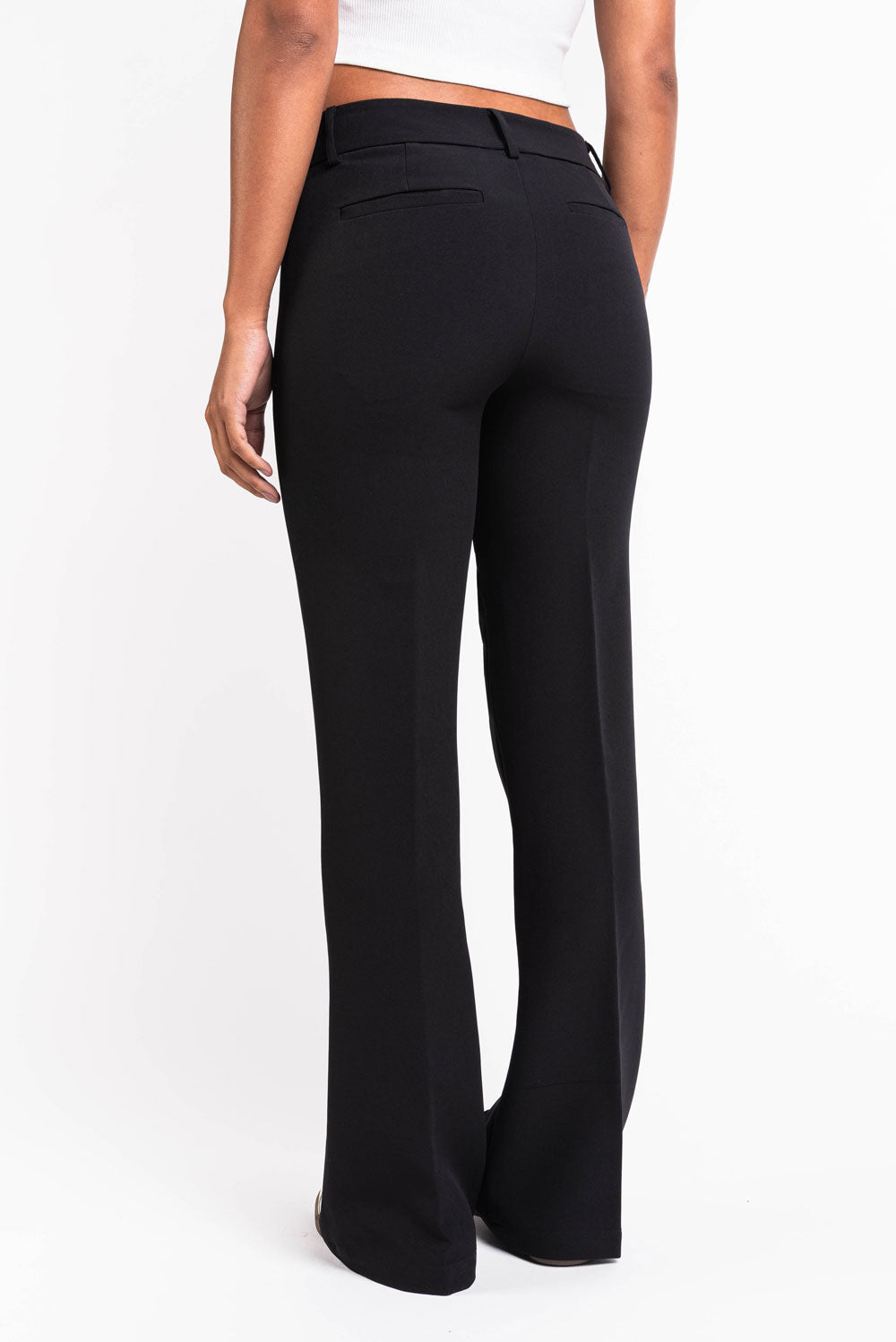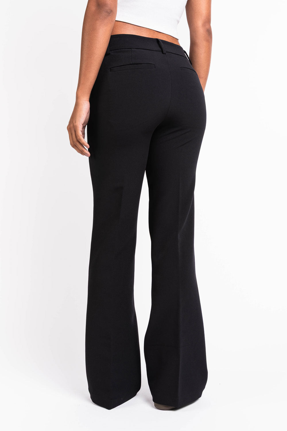Suit pants with a mid waist and flared legs. Made from a stretch fabric that ensures a comfortable fit all day. Featuring faux back pockets and wide belt loops to hold both narrow and wide belts. The pants close with a zipper, hook, and hidden button.
