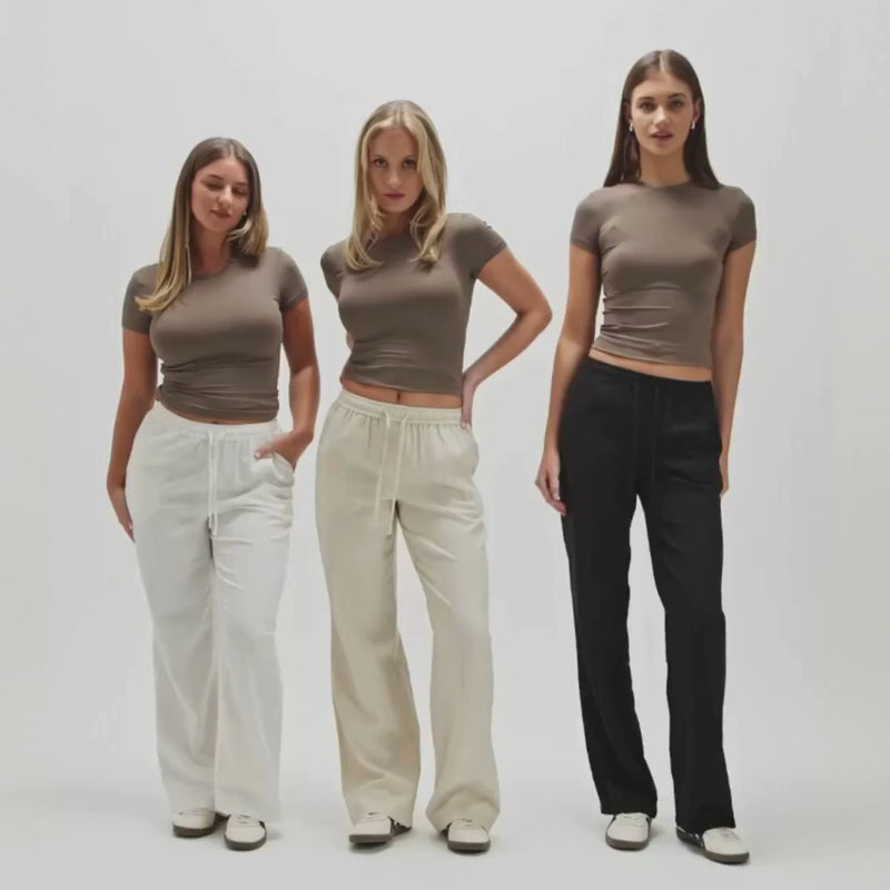These low-waist linen pants feature a relaxed straight-leg fit with side pockets for practicality. Designed with an elastic waistband and drawstring, they offer lightweight comfort for casual outfits.