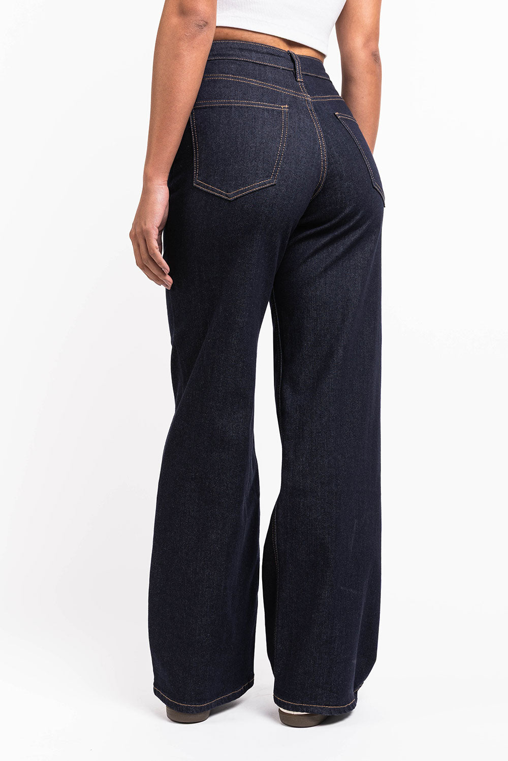 High waisted jeans with wide legs and pockets in the front and back. Belt loops that fit both thinner as well as a thicker belt. The pants close with a zipper and button.