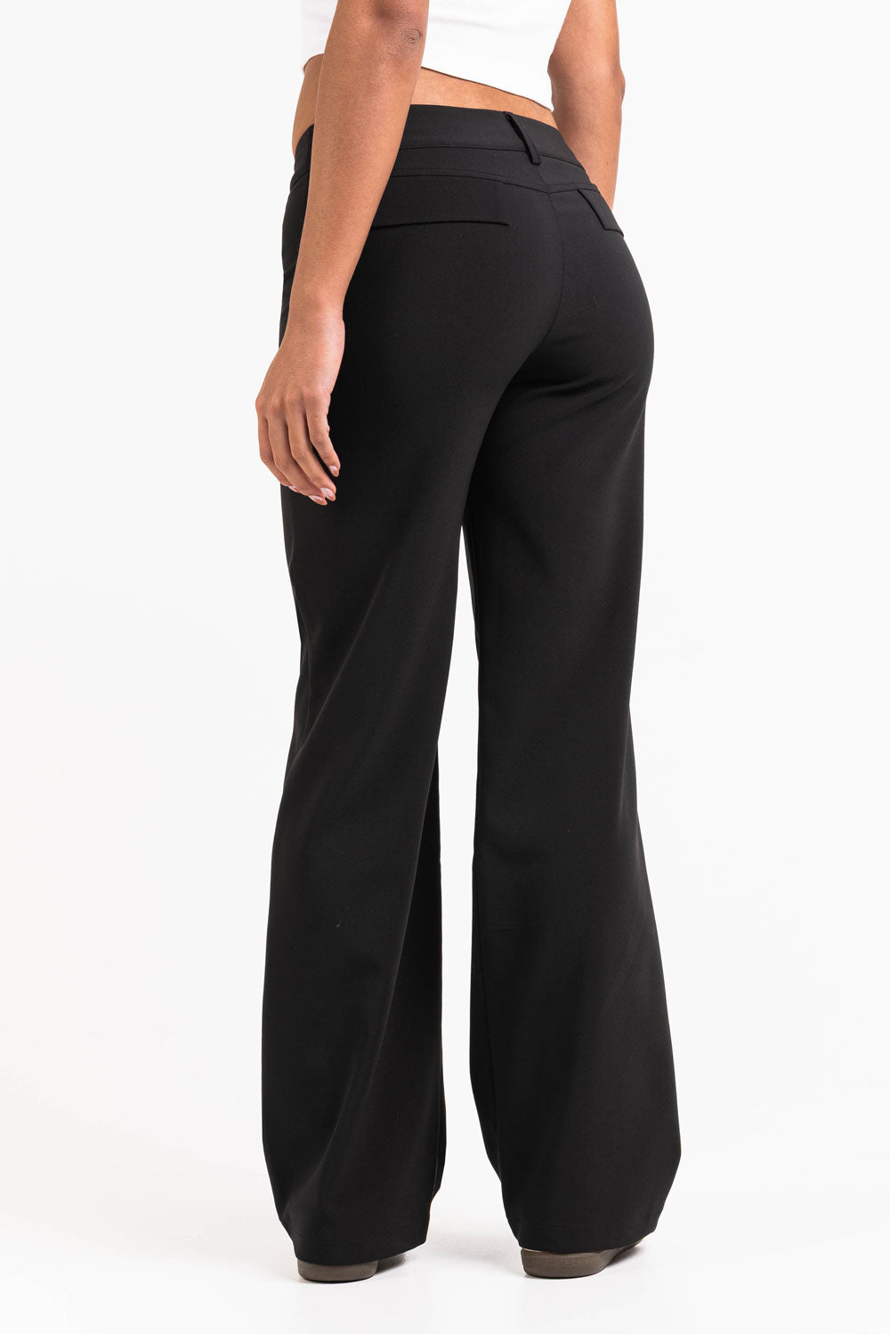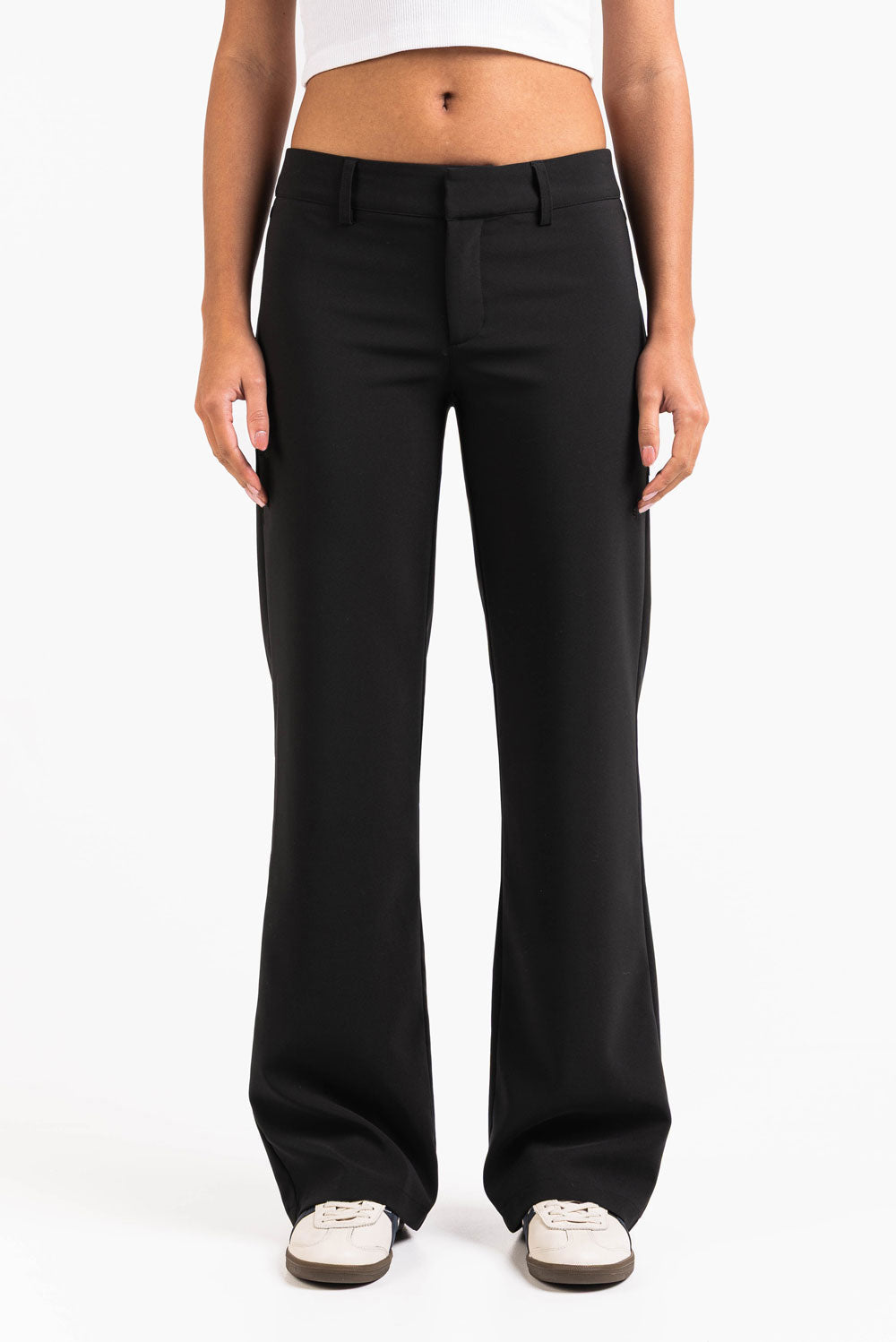 Anzughosen mit niedriger Taille und geradem Bein. Gefälschte Gesäßtaschen mit Klappen und Gürtelschlaufen, die sowohl schmale als auch breite Gürtel aufnehmen. Die Hose wird mit Reißverschluss, Haken und verdecktem Knopf geschlossen.