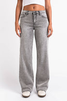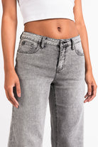 Mid waist-Jeans mit weitem Bein und Taschen vorne und hinten. Gürtelschlaufen, die sowohl für schmalere als auch breitere Gürtel geeignet sind. Die Hose wird mit Reißverschluss und Knopf geschlossen.