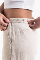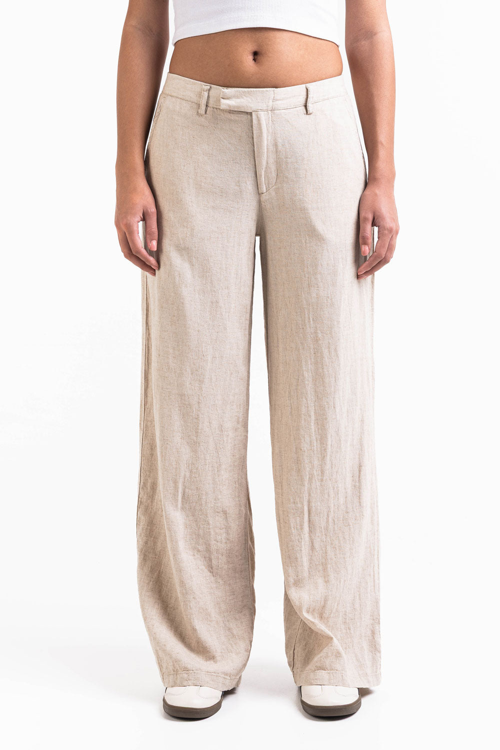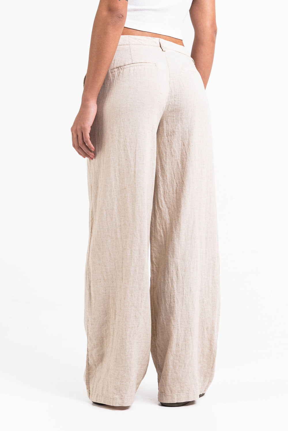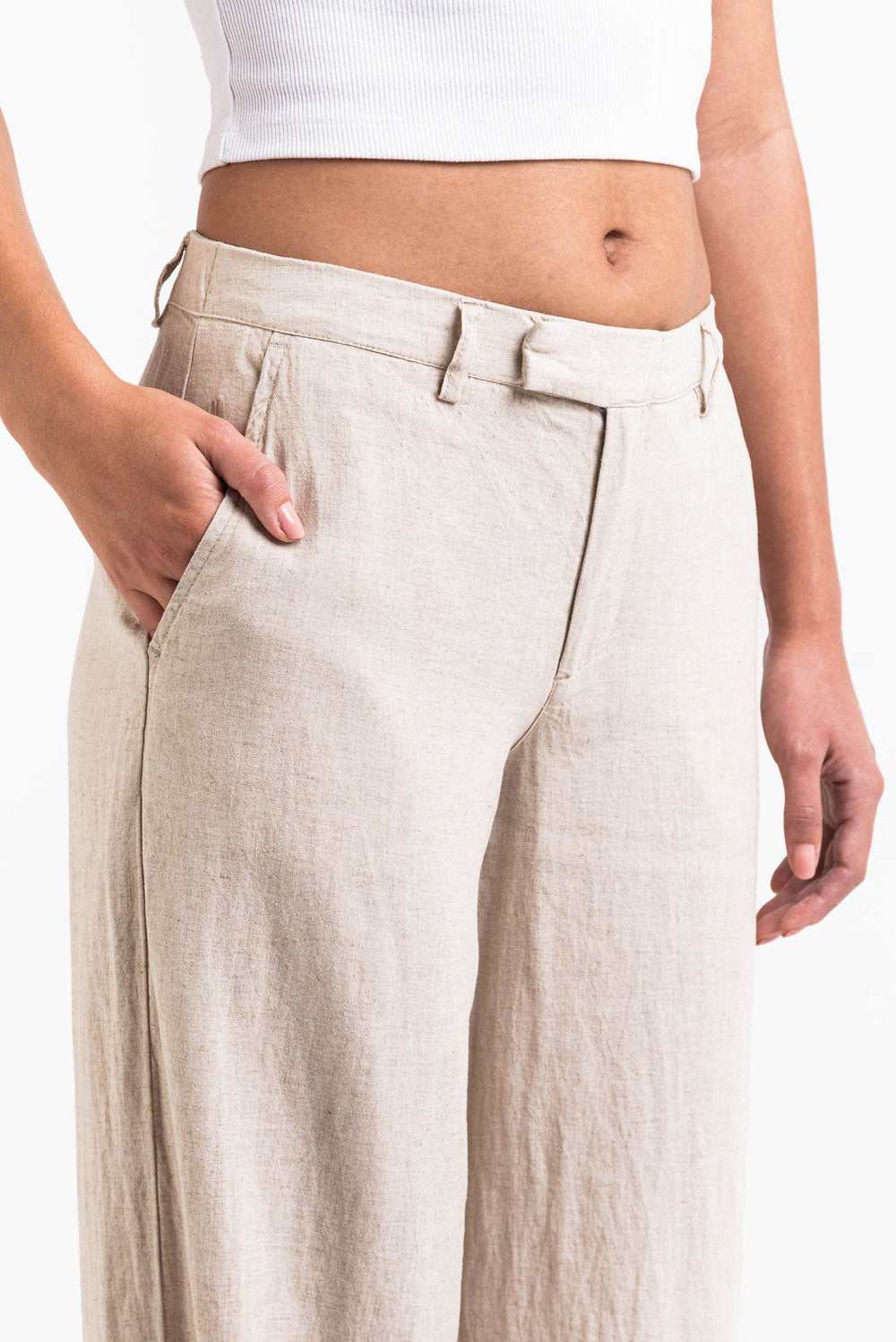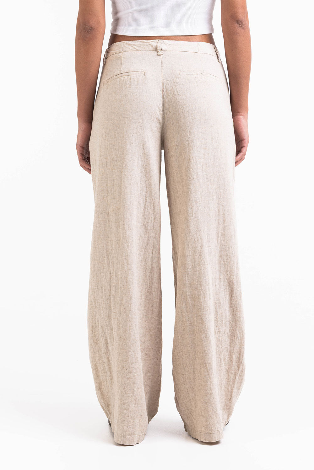 Mid-waist linen pants with wide legs and a relaxed fit. Side pockets, faux back pockets, and belt loops designed to fit both narrower and wider belts. The pants fasten with a zipper, hook, and a hidden button.